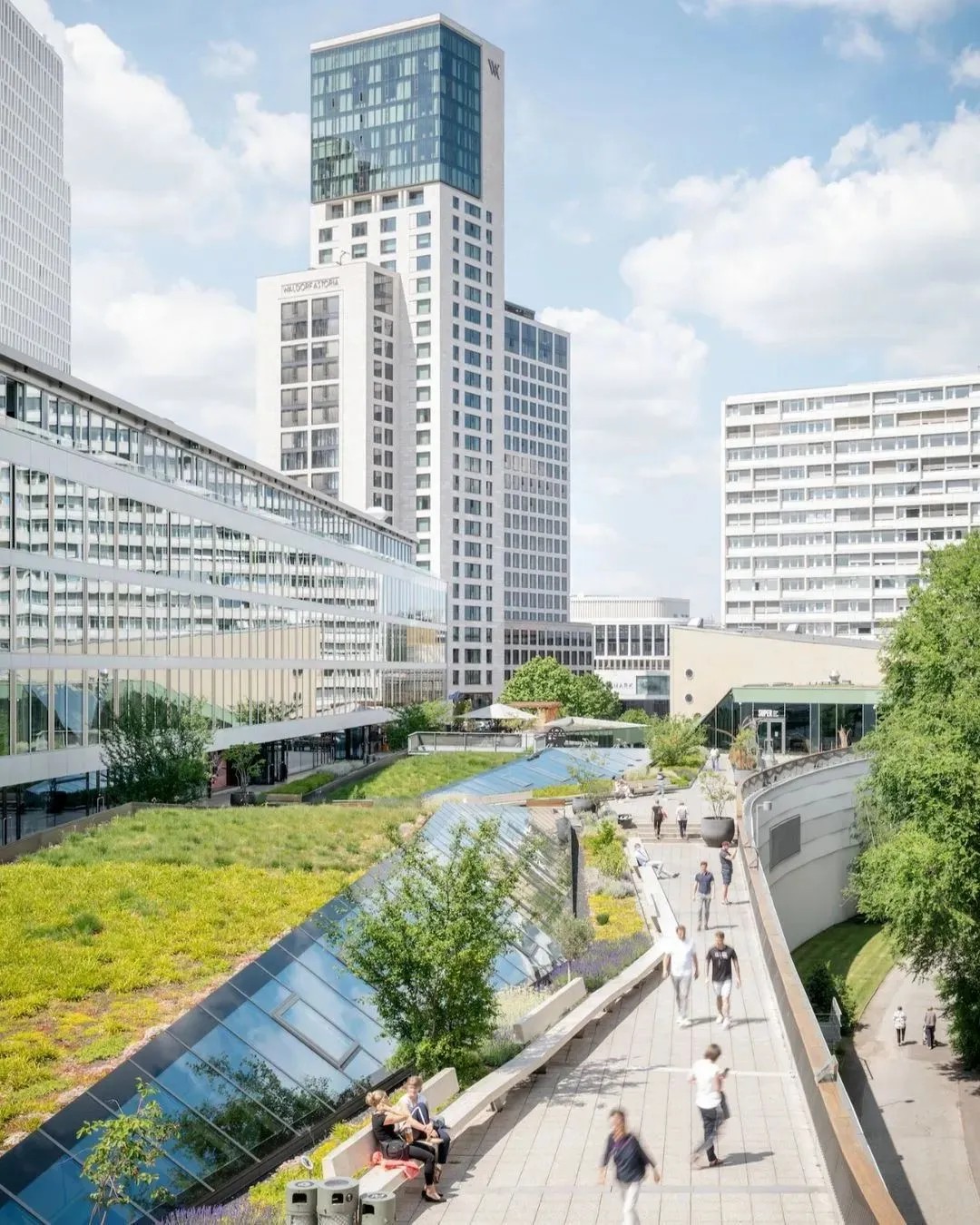 在商業(yè)的二層則設置了一個開放、通透的公共空間,同柏林潮流酒店25小時(Twenty five hours hotel)進行聯(lián)通。并以城市綠洲為設計概念,在頂層設計了一個布滿植物盆栽的七千平方公尺的天臺,供給顧客休憩社交,營造自由、無拘束的商業(yè)氛圍,與項目的整體定位相得益彰。