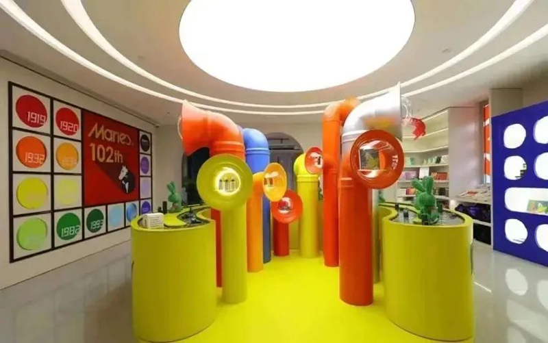 Mamǎfufú將“小紅閑”這一概念發(fā)揮得淋漓盡致,無論是整體的場景風(fēng)格,對于色彩的靈活運(yùn)用,還是互動(dòng)體驗(yàn)的內(nèi)容和品牌首店引入,都創(chuàng)造了極高的出片效果,吸引眾多年輕人前來打卡消費(fèi)。Mamǎfufú超級百貨是一個(gè)跨界聯(lián)合的潮流文創(chuàng)空間,占據(jù)了M+馬利位置最好的沿街二樓,無論室外的墻體,還是室內(nèi)的布置,均大面積運(yùn)用了極具張力的紅黃藍(lán)三原色,將“馬利”這個(gè)百年顏料品牌的“色彩主義”貫穿于整體空間設(shè)計(jì)中。1000㎡的空間內(nèi)營造了8個(gè)主題區(qū)域,設(shè)置馬利趣味工廠、馬利畫材、POP-UP Market、色彩理想國、靈感書集、色彩生活集市、色彩沙龍等主題區(qū)域,涵蓋藝術(shù)展覽、手工工作室、畫材、圖書、生活家居、藝術(shù)衍生、服裝零售等多種業(yè)態(tài)內(nèi)容。