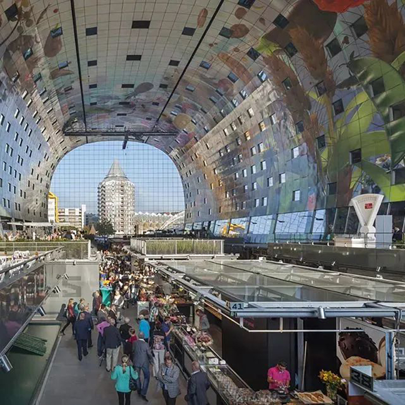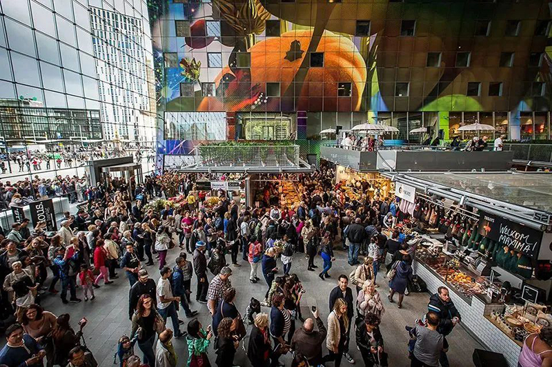 開創(chuàng)「美食市集」先河的荷蘭Markthal市場,自2014年開業(yè)以來,就受到全球各界人士的關(guān)注,年均吸引參觀游客達4.5-7百萬人次。作為荷蘭全國第一家室內(nèi)市集,以及結(jié)合居住和購物的新城市建筑類型,成功從傳統(tǒng)的菜市場轉(zhuǎn)型為具備藝術(shù)性的文藝空間、生活集市、展覽空間、創(chuàng)意工作室、綠色休閑空間以及特色居住單元空間。