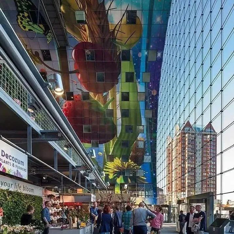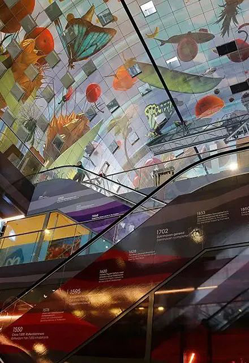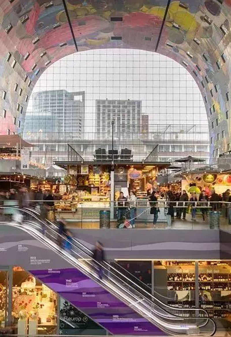 建筑弧形的內(nèi)面11000㎡的彩色藝術(shù)品“豐饒之角”,是由Arno Coenen和Iris Roskam創(chuàng)作而成,將水果、魚、面包、鮮花與附近的大教堂等元素重疊交織而成。項目除兼?zhèn)鋫鹘y(tǒng)菜市場銷售食材的功能外,消費者還能在“美食市集”享受餐飲的服務和游逛的體驗,大大滿足人們的訴求。