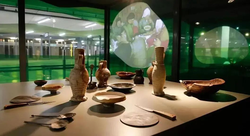 項目舊址在1940年的一次戰(zhàn)爭中歷史建筑都被摧毀,Markthal市場再建設(shè)時,地下考古團隊發(fā)現(xiàn)了各種各樣的中世紀物品。為予以紀念,便以垂直展覽的形式在市場內(nèi)的自動扶梯上展示。