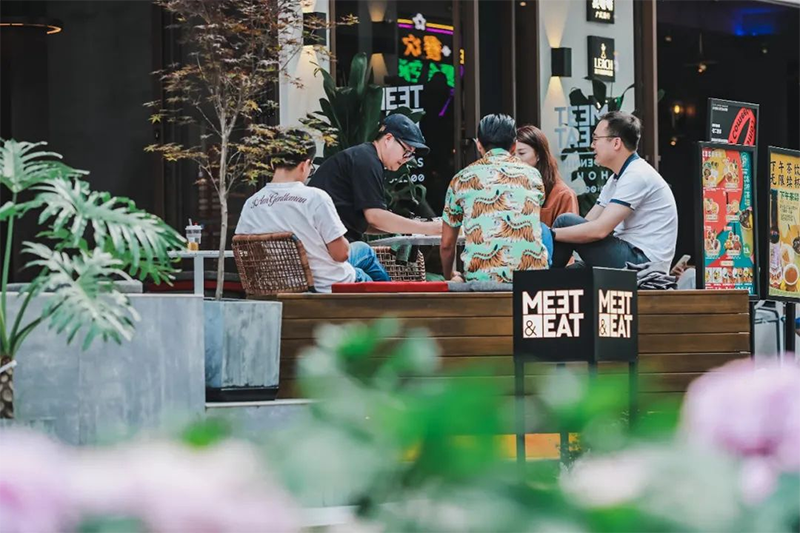 項目通過將調(diào)性契合的小眾品牌聚集,避免商業(yè)項目被一個個孤立且陌生的品牌瓜分,形成一個完整且相互聯(lián)動的品牌集合,打造新型社交場景下的美食市集空間。MEET&EAT猶如一個專注于餐飲內(nèi)容的買手店,充分利用小眾優(yōu)質(zhì)品牌的同時,有目的地孵化出所需的餐飲內(nèi)容,除了可以體驗“早C晚A”外,還能讓川味小吃店與面館做鄰居,攜手推出套餐。