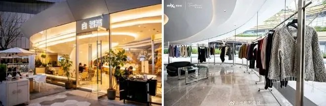 二者通過中間的三個異形玻璃盒子串聯(lián),分別進駐了Snow Peak(西南首家購物中心店)、ROARINGWILD成都首家限時概念店、中式茶飲品牌“白福福”,十分吸睛。