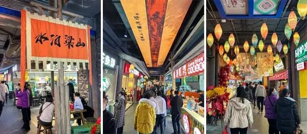 宋朝食間是以大宋文化為主題的街區(qū),還原宋朝文化、藝術、生活場景,加入水泊梁山和水滸英雄好漢場景元素,打造了沉浸式宋風實景生活餐飲主題街區(qū)。