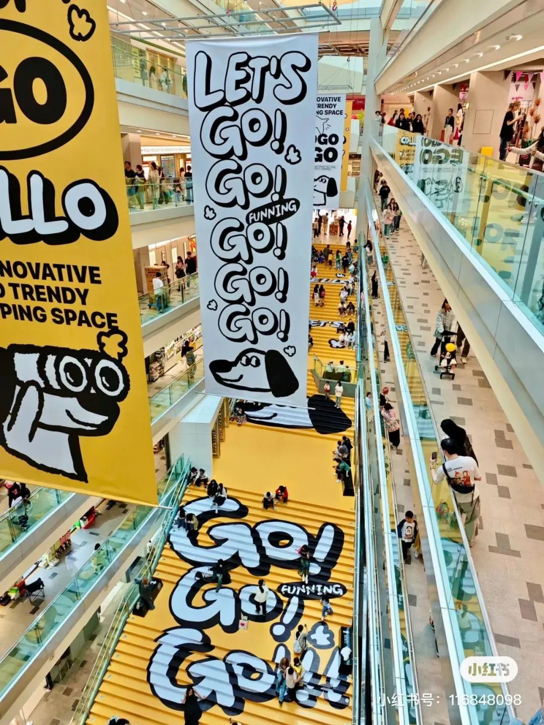 抵達商場入口,一抹鮮亮黃彩瞬間吸引目光;步入大堂,簡潔廣告語映入眼簾,色調(diào)與設(shè)計渾然統(tǒng)一,主通道沐浴在明媚黃光中,配以吉祥物GoGo萌態(tài)畫像,攝影佳作信手拈來,隨手一拍皆是風(fēng)景畫。