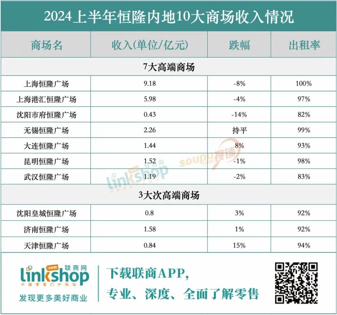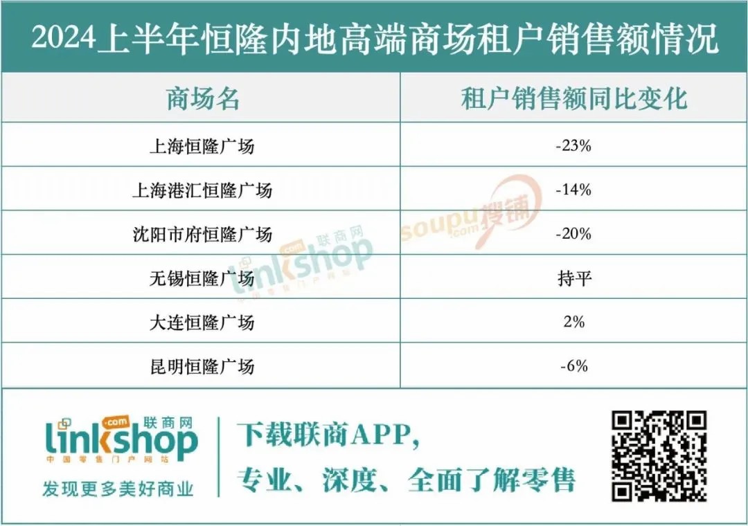在恒隆集團(tuán)的高端商場(chǎng)中,大連恒隆廣場(chǎng)脫穎而出,實(shí)現(xiàn)業(yè)績(jī)?cè)鲩L(zhǎng),得益于其成功轉(zhuǎn)型為地區(qū)高端零售地標(biāo)并吸引高端品牌入駐。相比之下,上海港匯恒隆、沈陽(yáng)市府恒隆、昆明恒隆及武漢恒隆等四大商場(chǎng)均面臨收入和租戶銷售下滑的挑戰(zhàn),而無錫恒隆則保持業(yè)績(jī)平穩(wěn)。