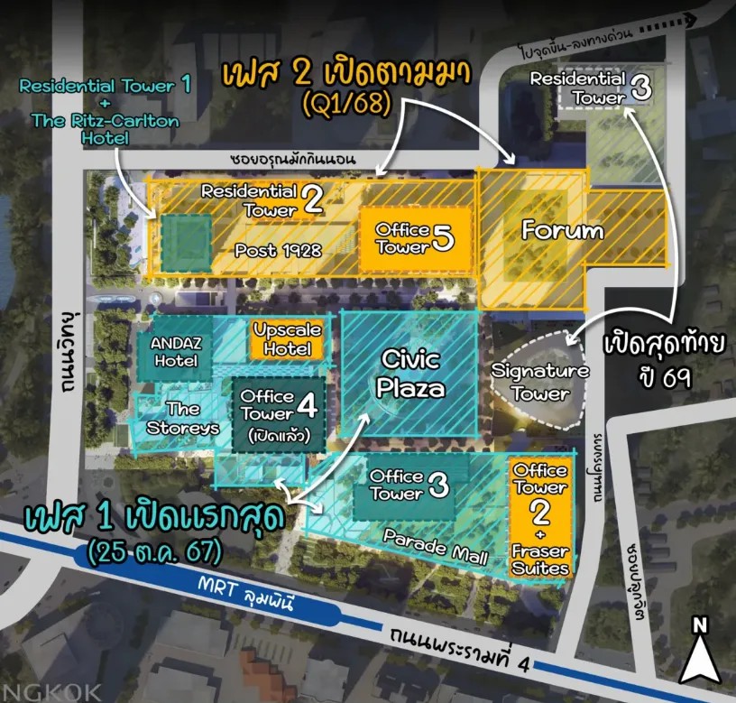 辦公樓方面,現(xiàn)階段3號塔、4號塔和5號塔已經(jīng)陸續(xù)投入使用,包括律師事務所Baker & McKenzie Ltd.、雅詩蘭黛集團、寶馬集團、KGI Securities、Menarini、LINE MAN Wongnai等跨國公司都已選擇將辦公地點遷至于此。