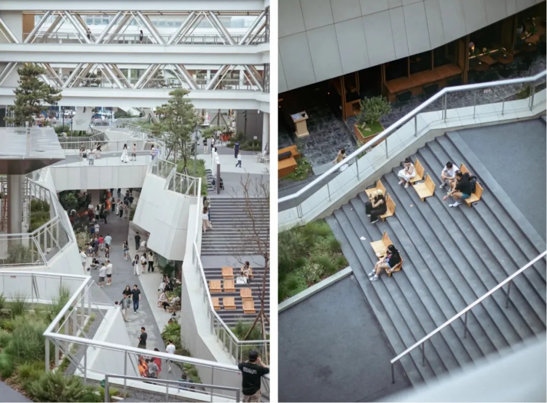 CyPARK地面層既有開(kāi)闊的公共區(qū)、又有相對(duì)私密的小空間,形成了自由舒適的公園氛圍。通過(guò)各種大階梯、手扶梯等垂直交通,結(jié)合廊橋、半開(kāi)放式的回廊,形成一座處處可以滲透進(jìn)公園景觀的多層立體空間。
