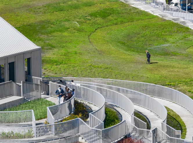 在建設空間設計上,項目將市場與公共綠地完美融合,摒棄了傳統(tǒng)菜市場簡單金屬棚的形式,屋頂打造為被草地和花田覆蓋的公園。建筑呈現(xiàn)為一個簡單的開放式結構,起伏的綠色屋頂猶如延綿的山丘,屋頂?shù)臇|側角落是一塊種植著繽紛植物和花卉的階梯狀區(qū)域,屋頂從該側向下延伸至地面,使游客可以輕松到達建筑頂端。在建筑的側面,一個簡單的四層結構容納了市場的行政辦公室和展覽中心,后者可用于展示當?shù)氐霓r(nóng)業(yè)產(chǎn)品。