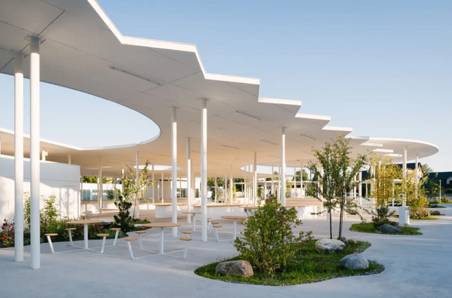 此外,廣場光滑的混凝土面層沒有路緣石,無論是步行、坐輪椅還是滑滑板都可以在市場上安全自由地移動,方便了不同人群的使用,體現(xiàn)了設計的人性化和包容性;各種街道固定裝置如白色的圓形信息板、自行車架、巨石、鳥類和昆蟲屋及社區(qū)共用桌椅等點綴其中。在極具特色的有機屋頂下,還設有帶木雕動物造型搖椅的游樂花園,為集市增添了藝術氛圍和趣味性。